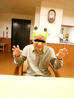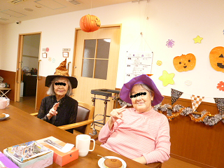 とても笑顔で「うれしい、うれしい」と喜んでいらっしゃいました。 10月末はハロウィンです。少し早いですが、帽子・カチューシャをつけて仮装しました。